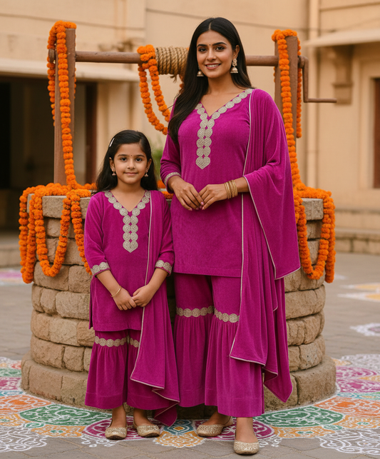 Pink & Gold Mother-Daughter Twinning Set β Elegant Festive winter Wear
