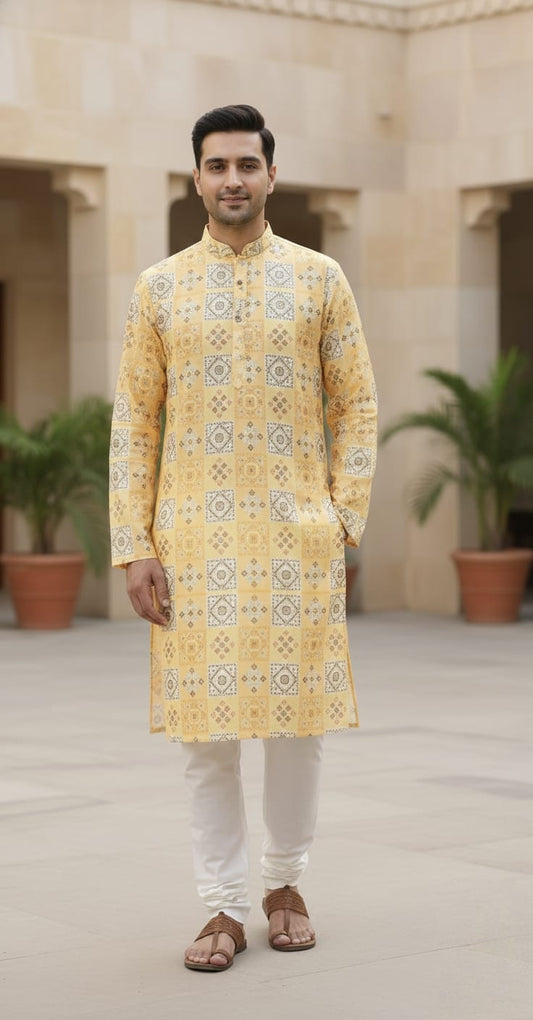 Father-Son Yellow Printed Kurta Pajama Combo Set