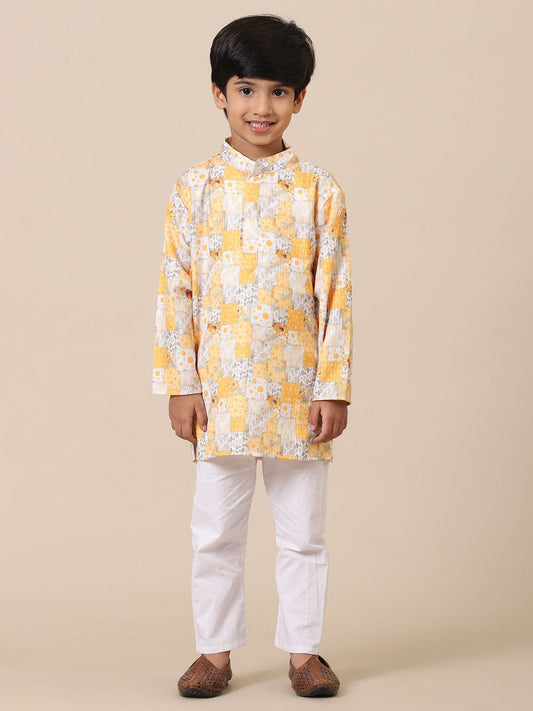 Father-Son Yellow Floral Checkered Kurta Pajama Combo Set