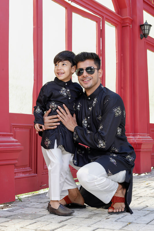 Father-Son Black Diamond Pattern Embroidered Kurta Pajama Combo Set