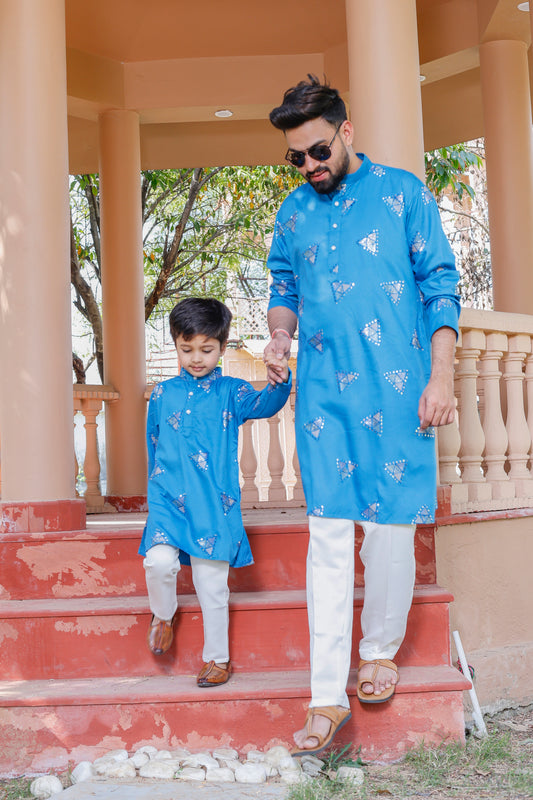 Father-Son Blue Diamond Pattern Embroidered Kurta Pajama Combo Set