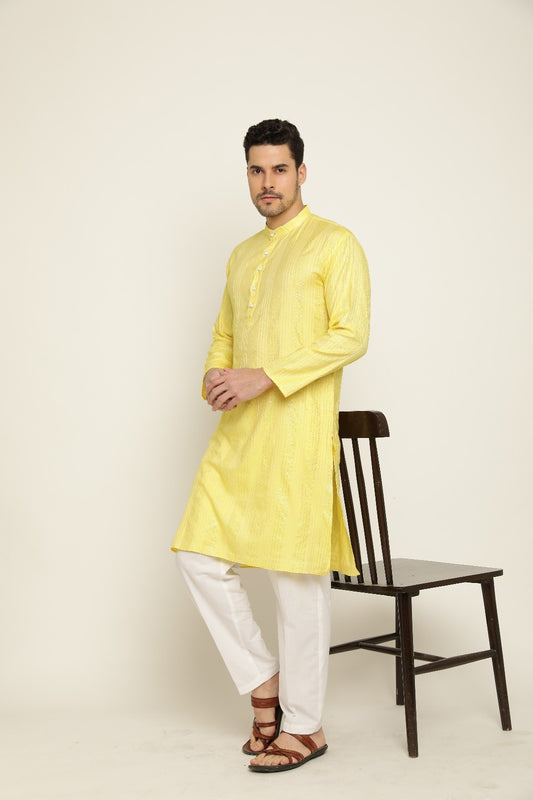 Father-Son Yellow Diamond Pattern Embroidered Kurta Pajama Combo Set