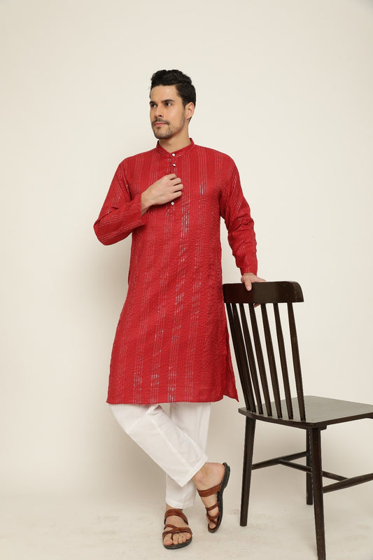 Father-Son Red Self-Striped Dhoti Kurta Pajama Combo Set