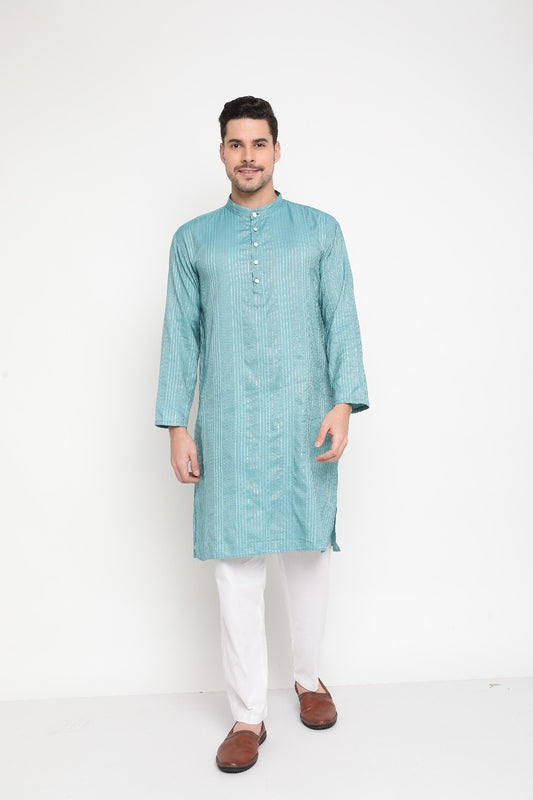 Father-Son Aqua Blue Self-Striped Dhoti Kurta Pajama Combo Set