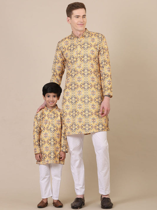 Father-Son Yellow Geometric Print Kurta Pajama Combo Set