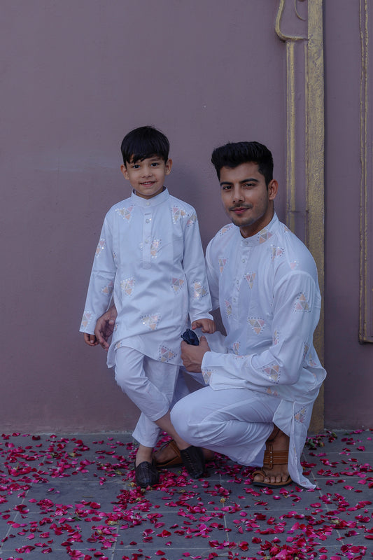 Father-Son White Diamond Pattern Embroidered Kurta Pajama Combo Set