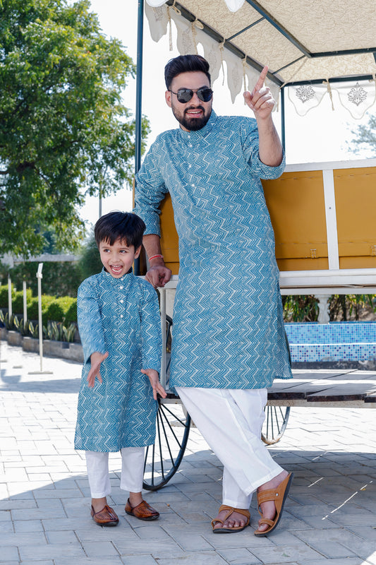 Father-Son Blue Zigzag Print Kurta Pajama Combo Set