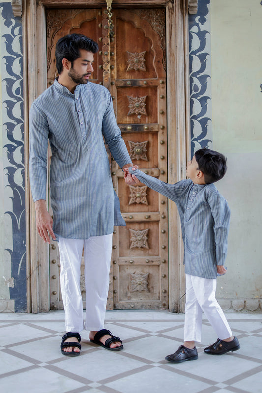 Father-Son Steel Grey Stripe Kurta Pajama Combo Set