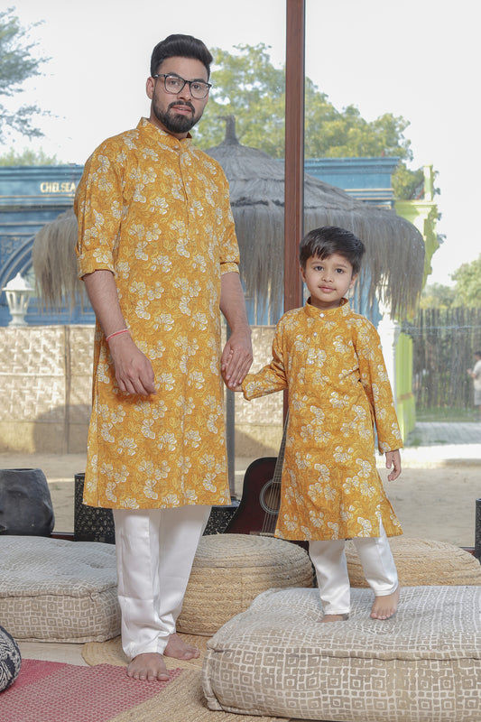 Father-Son Golden Marigold Floral Kurta Pajama Combo Set