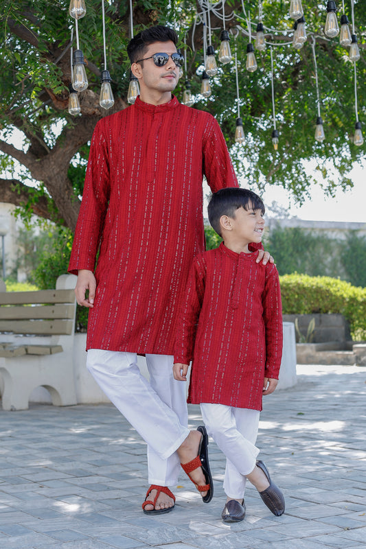 Father-Son Red Schiffli Kurta Pajama Combo set