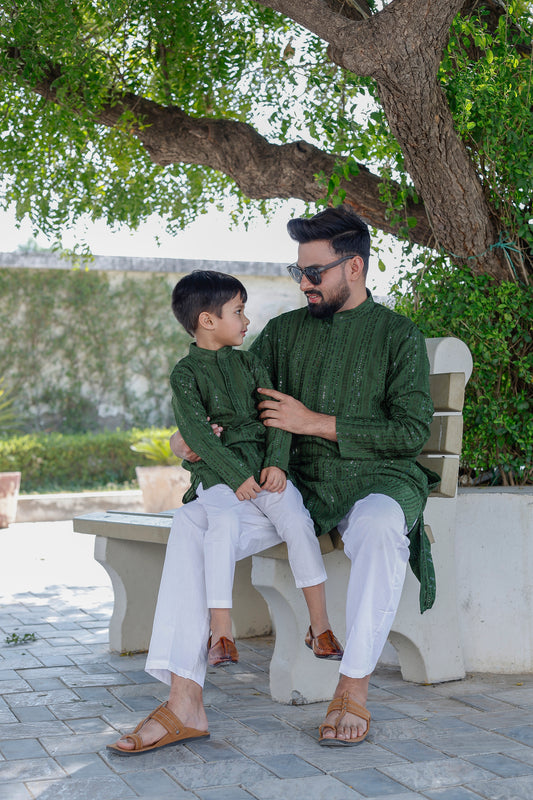 Father-Son Green Schiffli Kurta Pajama Combo Set