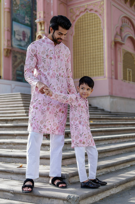 Father-Son Pink Floral Kurta Pajama Combo Set
