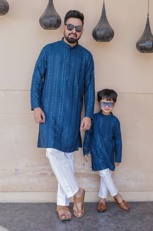Father-Son Royal Blue Schiffli Kurta Pajama Combo Set