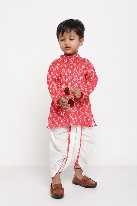 Father-Son Vibrant Red Ikkat Print Dhoti Kurta Pajama Combo Set