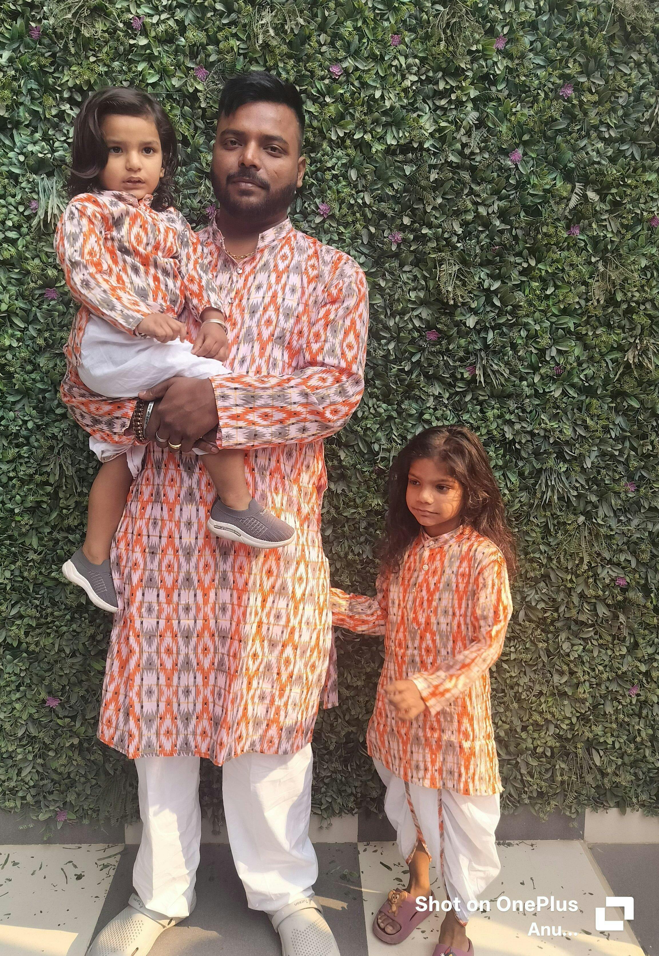 Celebrate timeless father-son style with this vibrant orange ikat print kurta pajama combo set—perfect for festive occasions, family photos, and cultural celebrations.