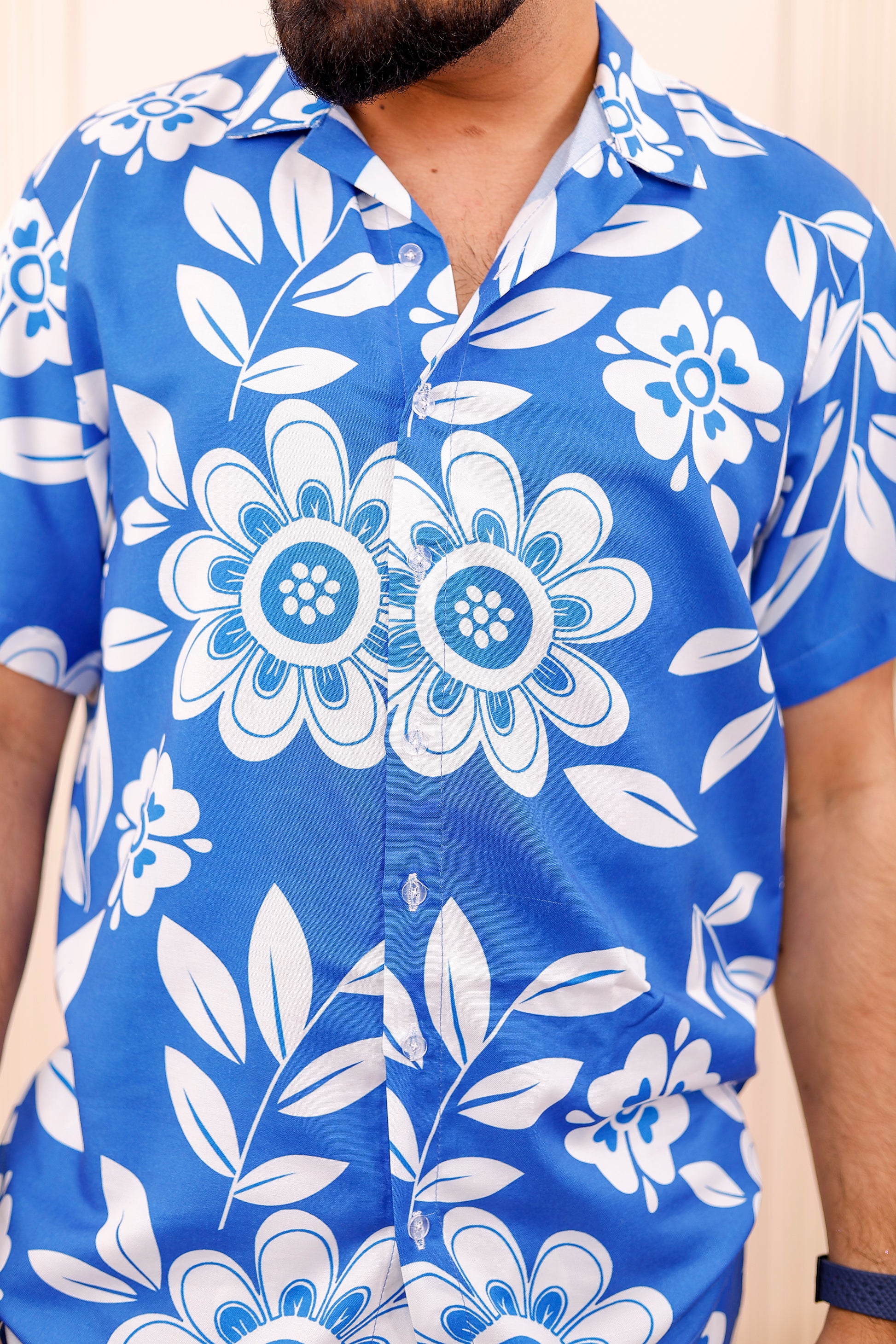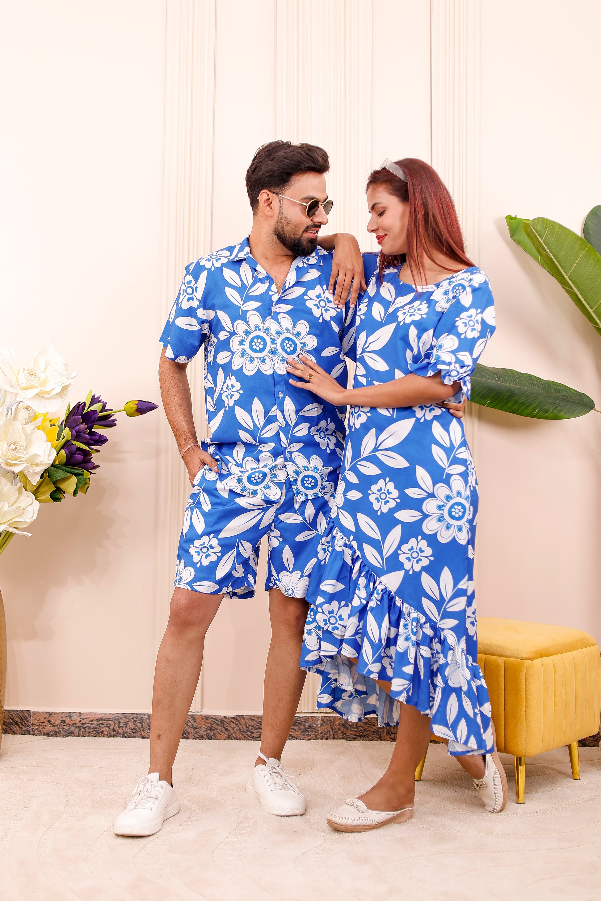 • Men: Matching royal blue floral co-ord set with printed shirt and shorts