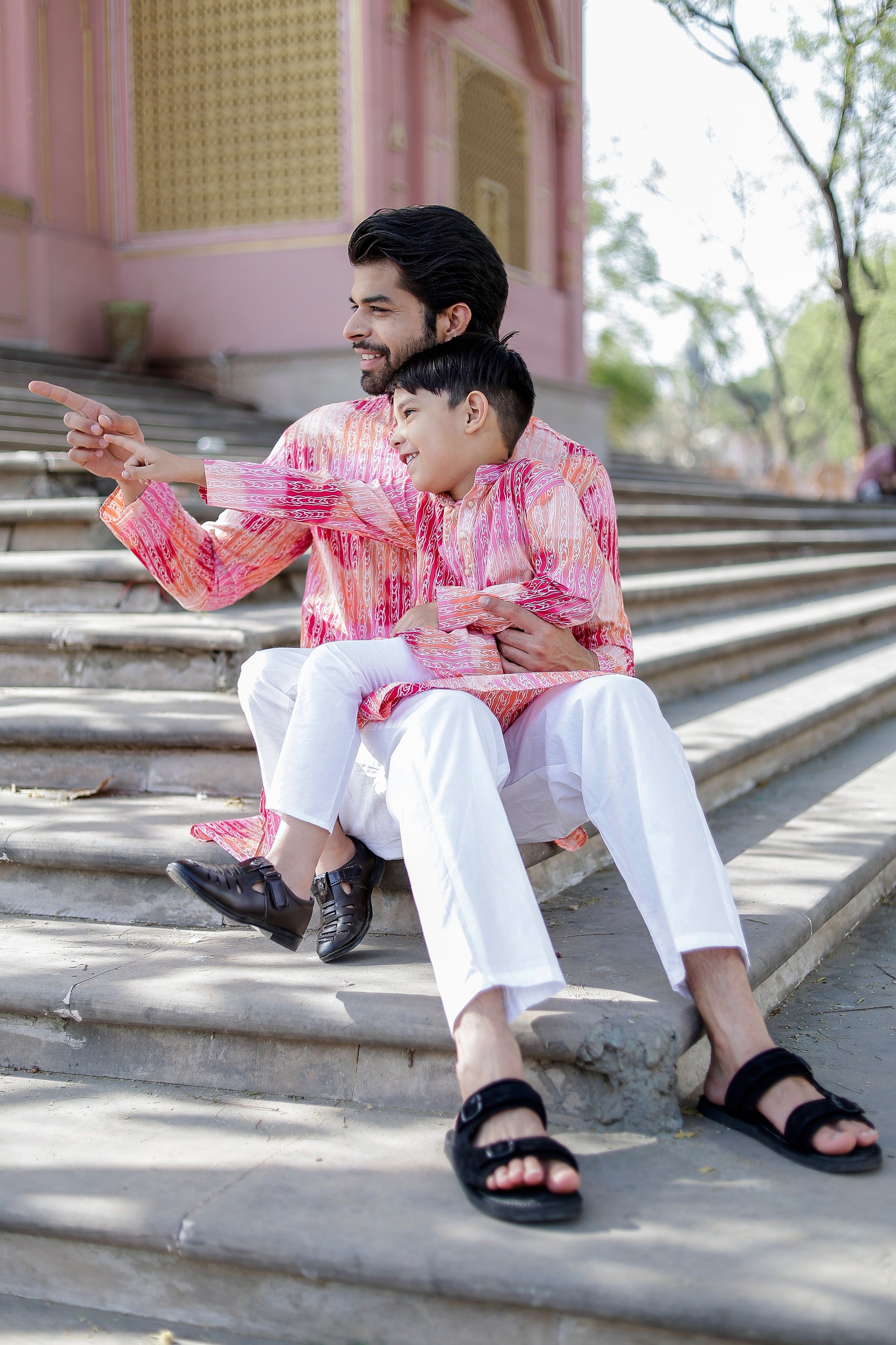Celebrate the bond of tradition and love with our Father-Son Pink Ombre Printed Kurta Pajama Combo Set. Perfect for festive twinning, weddings, and family photoshoots, this matching ethnic wear ensures you and your little one shine together in every celebration.