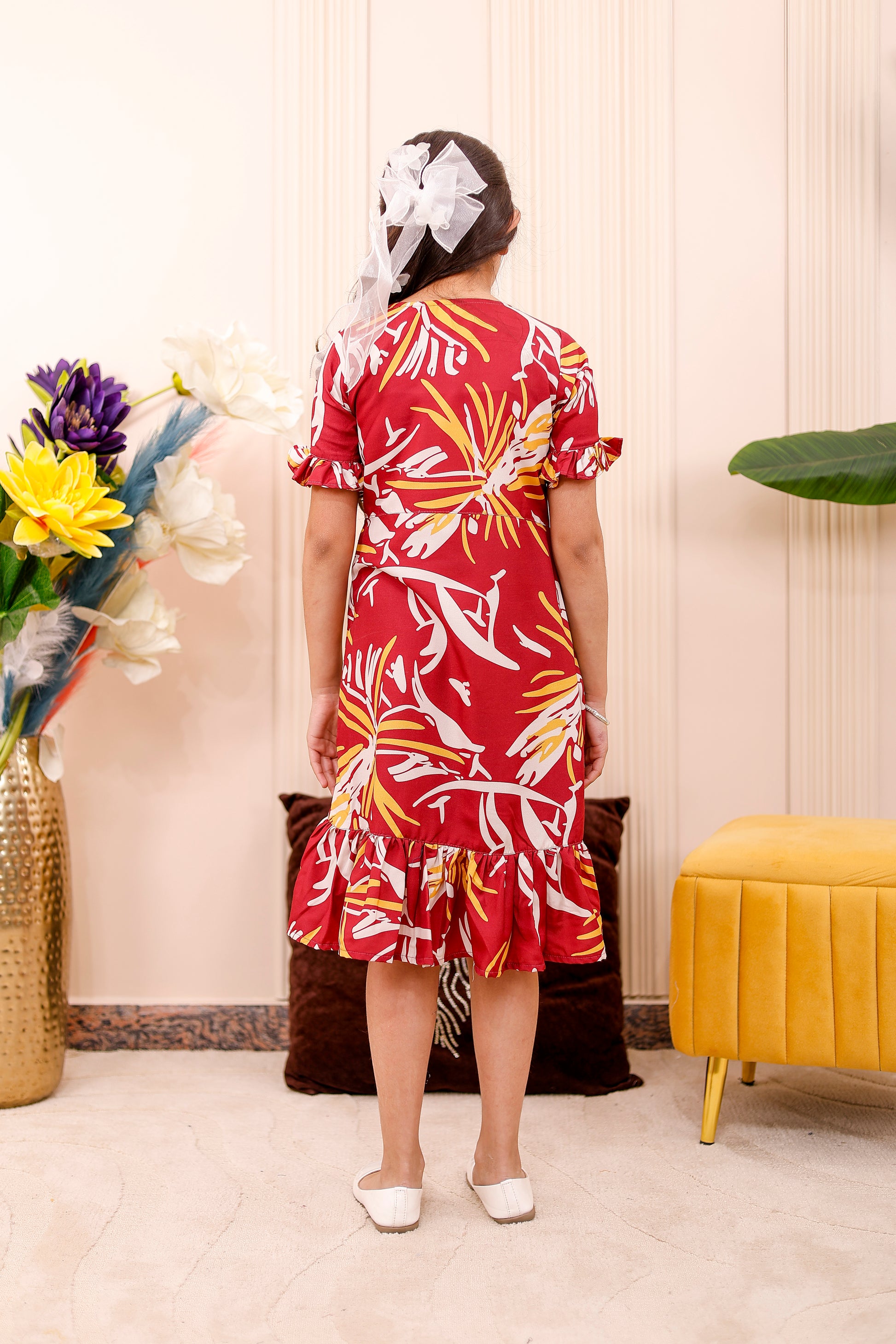 • Women & Girls: Knee-length abstract print dress with frill sleeves — flowy, comfortable, and perfect for mother-daughter matching.