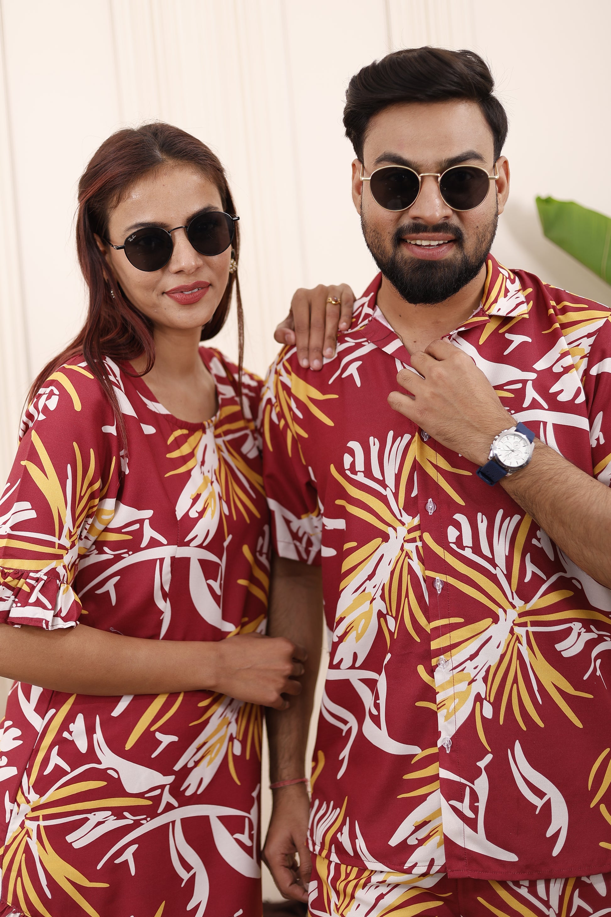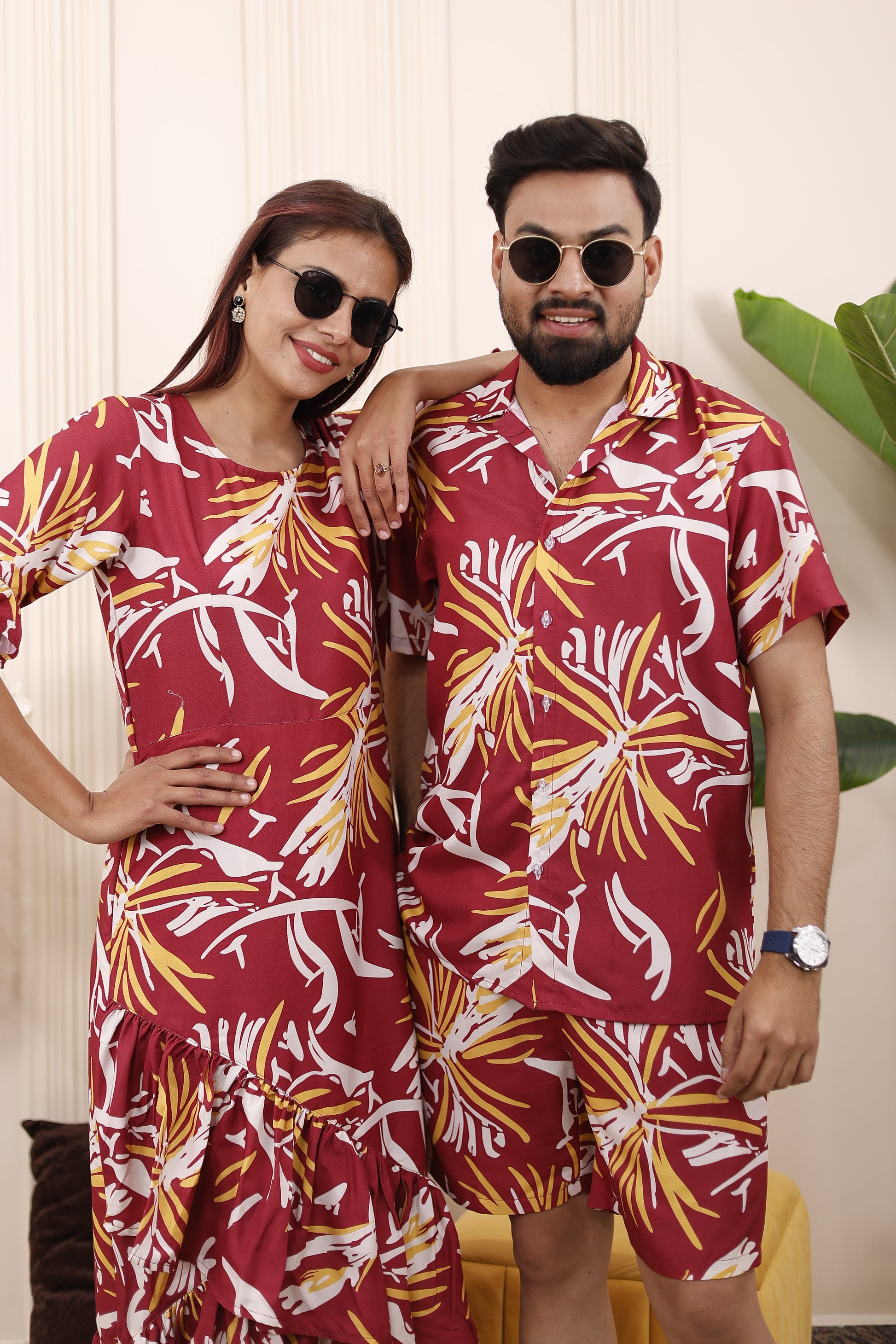 • Men & Boys: Matching maroon abstract printed co-ord set with shirt and shorts — breathable, stylish, and ideal for father-son twinning.