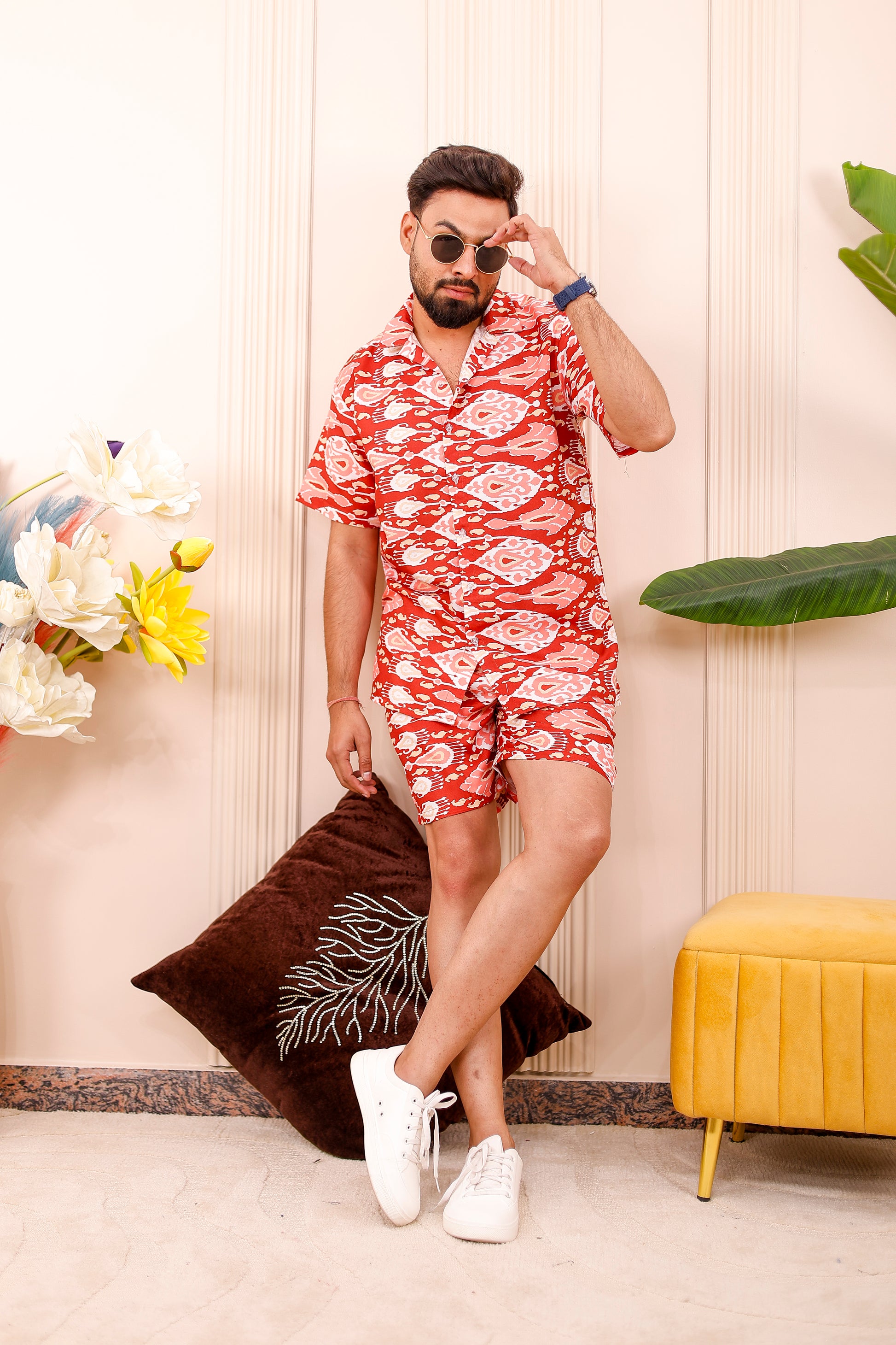 • Men & Boys: Matching ruby floral printed co-ord set with shirt and shorts — stylish, lightweight, and perfect for father-son twinning.